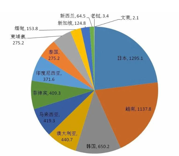 2021年,我国对RCEP成员国出口纺织服装5623.1亿元,占我国纺织服装出口总值的27.6%。按单一国别计,我国纺织服装前十大出口市场中,RCEP成员国占五位,分别为日本、越南、韩国、澳大利亚和马来西亚,分别出口1295.1亿元、1137.8亿元、650.2亿元、440.7亿元、419.3亿元,分别占我国纺织服装出口总值的6.4%、5.6%、3.2%、2.2%、2.1%。