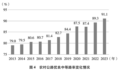 路况水平实现跨越式提升。持续加大养护投入,全面开展日常养护,大力实施养护工程,农村公路养护工程年均比例超5%。十年来,累计实施修复养护工程184万公里,优良中等路率④从79%上升至91.1%,基本实现“有路必养、养必到位”。(见图4)