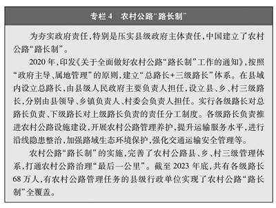 完善政策制度。出台《关于推动“四好农村路”高质量发展的指导意见》等20余项政策文件,建立覆盖体制、机制、组织、监管、资金、考核、服务等领域的农村公路政策制度体系。把责任制作为管理的重中之重,出台《关于深化农村公路管理养护体制改革的意见》,确立省、市级政府加强统筹和指导监督、县级政府履行主体责任,建立县级相关部门、乡级政府农村公路管理养护权力和责任清单,形成上下联动、密切配合、齐抓共管的工作局面。建立农村公路“路长制”(见专栏4),由县、乡两级行政负责人和村(居)委员会负责人担任路长,实现跨部门协同,推动政府主体责任高效落实,使农村公路管理逐步从粗放向精准、从被动向主动、从单打独斗向齐心协力转变。