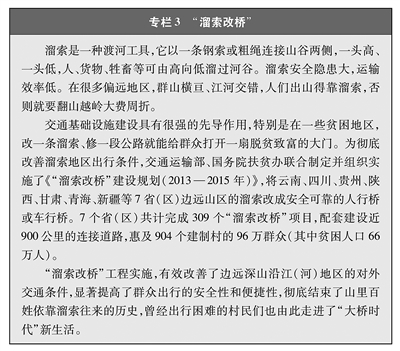 解决特殊地区出行难题。改一条溜索、修一段公路就能给群众打开一扇脱贫致富的大门。为了保障偏远山区百姓安全出行,推动“溜索改桥”建设,专项资金支持、精心组织实施,用3年时间彻底改善了溜索地区出行条件(见专栏3)。推进“直过民族”③和人口较少民族聚居区农村公路建设,解决民族地区交通闭塞的突出问题,加快民族地区脱贫致富步伐。