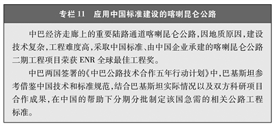 自2012年中国正式发布《公路工程技术标准》《公路桥涵设计通用规范》《小交通量农村公路工程技术标准》等首批10项公路工程行业标准外文版以来,目前已累计发布73项外文版标准,包括英、法、俄三个语种,涵盖公路、桥梁、隧道的勘察、设计、施工、养护、质量检验评定等主要专业技术领域,中国公路工程行业标准外文版体系已经基本形成,为发展中国家公路建设贡献了中国方案。中国公路标准在全球数十个国家数百个项目中得到应用,印尼泗马大桥、莫桑比克马普托大桥等都是采用中国标准建设的典范项目。中国在尼泊尔、莫桑比克等发展中国家援建的农村公路也均采用中国标准建设,以其经济、耐久、安全、舒适等技术特点造福当地百姓(见专栏11)。