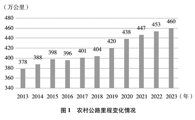 里程规模显著增长。十年来,新改建农村公路250余万公里。截至2023年底,农村公路总里程达到460万公里,长度可绕地球赤道115圈,十年间增长21.7%。县道、乡道、村道里程分别达到70万公里、124万公里、266万公里。农村公路桥梁达到53万座、隧道2222座。形成了一张县道沟通城乡、乡道往来交织、村道抵田连户的农村交通基础设施网络。(见图1)