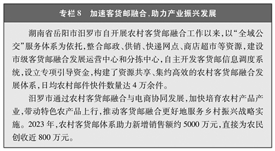 加快推进农村客货邮融合发展。为统筹解决农村客运可持续运营、快递下乡进村和农产品出村进城难题,发布《关于加快推进农村客货邮融合发展的指导意见》,坚持“政府引导、市场主导”,深入推进农村客货邮运行机制、基础设施、运输线路、运营信息等共建共享,加强资源统筹利用,推动融合发展(见专栏8)。截至2023年底,所有省份和超70%地级以上城市建立了交通运输、邮政、商务、供销等部门共同参与的工作机制,共开通农村客货邮合作线路1.1万余条,共建成县、乡、村三级客货邮服务站点9万余个,形成“客运邮路”“货邮同网”等典型模式,有效巩固了通客车成果,农村物流、邮政快递降本增效取得明显进展,带动了农村电商、特色产业等蓬勃发展。