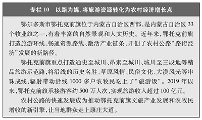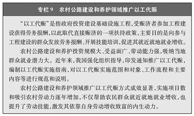 农村地区交通条件的持续改善吸引资本、项目和人才向农村流动,创造更多就业机会,拓宽农民群众致富增收渠道。各地还通过农村公路建设项目以工代赈(见专栏9)、开发农村公路公益性岗位等方式进一步拓宽农民群众就业渠道,实现农民群众就近就地就业增收。目前,农村公路建设项目以工代赈方式年吸纳农村劳动力约8万人,人均年增收约8500元;农村公路管理与养护领域提供就业岗位约85万个,人均年收入约1.3万元。