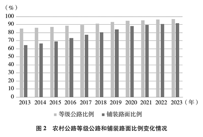 技术等级逐年提高。截至2023年底,农村公路等级路②里程及比例分别达到445万公里和96.8%,铺装路面里程及比例分别达到422万公里和91.8%,十年间分别提高了11.9个百分点、27.2个百分点。