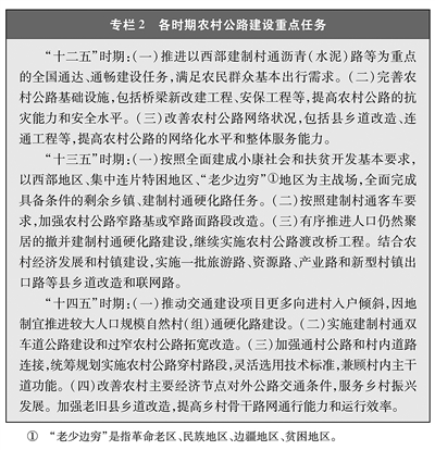系统谋划农村公路发展。农村公路中长期规划是农村公路事业持续健康发展的基本依据。我国2005年发布《农村公路建设规划》,2013年发布《集中连片特困地区交通建设扶贫规划纲要(2011—2020年)》,提出到2020年具备条件的乡镇和建制村通沥青(水泥)路等发展目标,把具备条件的乡镇和建制村通硬化路作为全面建成小康社会的交通运输兜底性任务,加大贫困地区农村公路建设力度。2021年发布《农村公路中长期发展纲要》,构建便捷高效的农村公路骨干路网、普惠公平的农村公路基础网络,科学指导全面建设社会主义现代化国家新征程阶段农村公路建设与发展。2022年发布《全国国土空间规划纲要(2021—2035年)》,引导农村公路与产业园区、旅游景区等协同布局,加强农村公路与乡村文旅资源和特色产业对接。