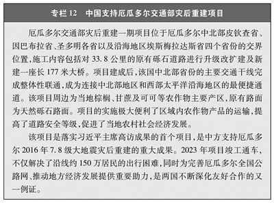 中国积极支持并参与发展中国家的农村公路建设项目,在其他发展中国家援建了大批农村公路基础设施项目,向世界农村公路领域分享中国方案、中国经验。通过参与项目建设、提供技术支持和人力资源,帮助当地改善农村地区道路基础条件(见专栏12),极大方便当地人民出行,大幅度降低物流成本,增强城乡互动,促进当地农产品的流通和市场接入,对消减贫困、改善民生、提升人民群众的生活水平,促进当地经济社会发展具有重要意义,深受当地百姓好评,如中国无偿援建的马达加斯加首都郊区公路项目,便利了马哈扎扎镇鸡蛋运输,促进了当地蛋鸡养殖业发展,这条路被当地人亲切地称作“鸡蛋路”。