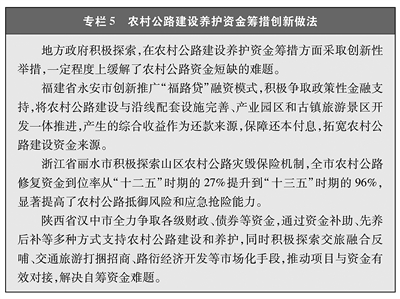 利用多元化市场融资方式拓宽融资渠道。充分发挥市场融资机制在农村公路发展中的重要作用,积极拓宽资金来源渠道。各地区结合实际,通过将农村公路与产业、园区、乡村旅游等经营性项目实行一体化开发等方式创新“农村公路+”投融资模式(见专栏5)。通过将农村公路管养纳入政府购买服务指导性目录,探索农村公路灾毁保险等方式支持农村公路养护。鼓励各类金融机构依法合规加大对符合条件的农村公路建设的支持力度。十年来,全国累计使用各类金融机构信贷资金约8000亿元用于农村公路发展。