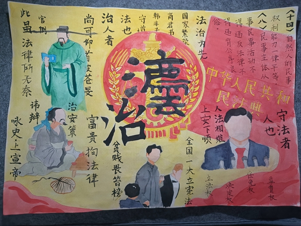 我校广大师生结合“宪法”“法治”和“法治中国”等主题创作了多幅作品,充分展现了学法用法、依法办事的良好精神风貌,各作品贴近师生、贴近生活、贴近实际,进一步阐释了传统文化作品的艺术魅力。挥洒笔墨的文化作品不仅书写着中国的法治精神,也浸润着师生对美好生活的向往,在激发广大师生传统文化兴趣的同时有效助力校园法治宣传教育走深走实。