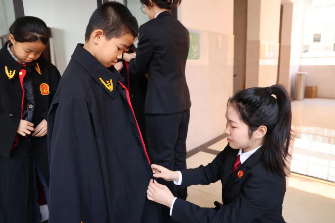在法官的引导下,同学们个个争先恐后,积极踊跃参与,身着法袍的“小法官”坐在审判席上,头顶国徽,敲击法槌体验坐堂审案。