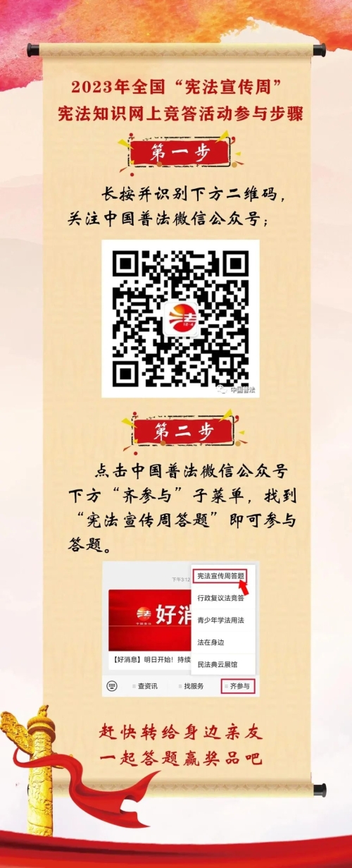 根据2023年全国“宪法宣传周”活动方案,“中国普法”微信公众号于12月1日至30日举办为期30天的宪法知识网上竞答活动,活动设置优胜奖,奖品为手机话费,活动结束后统一发放。