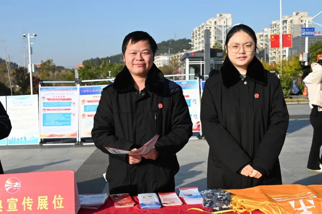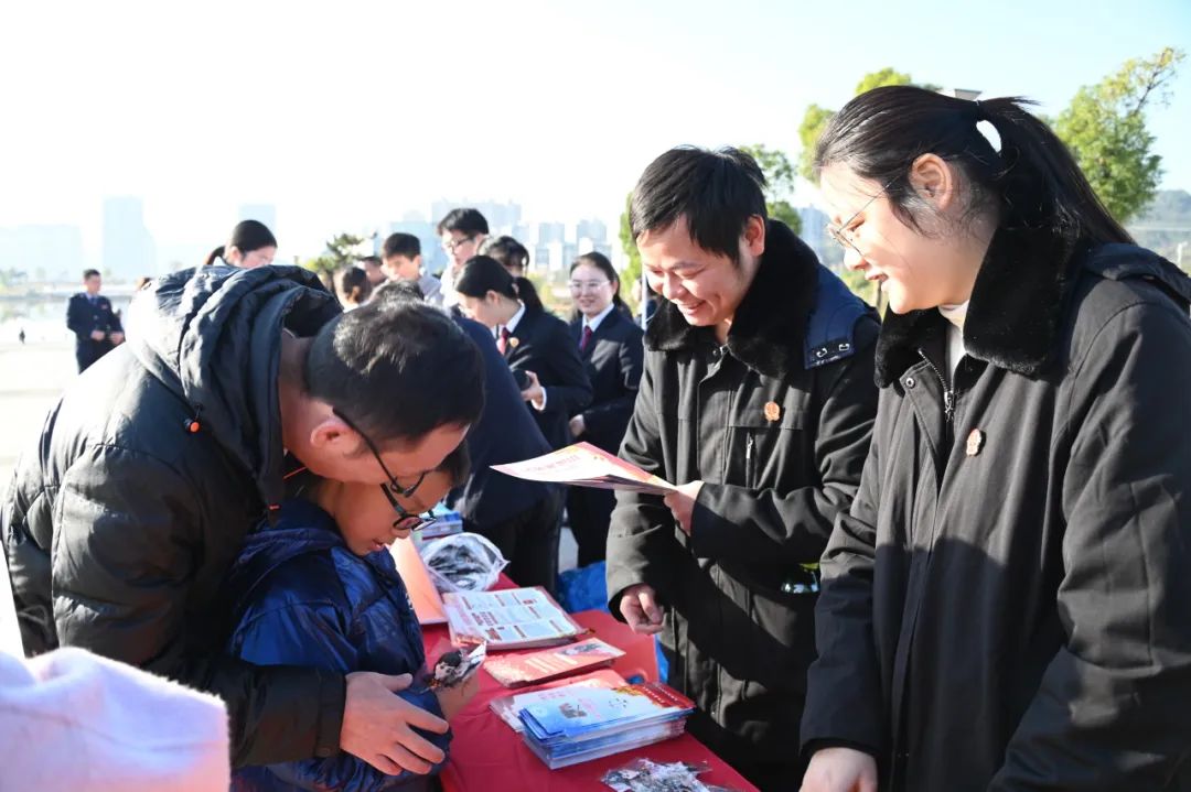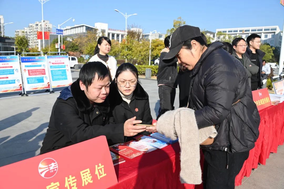 11月30日,在县龙湖公园广场,展位上整齐摆放着各类宣传资料,包括宪法宣传折页、民法典解读手册、反电信网络诈骗法指南等。法院干警们身着制服,面带微笑,热情洋溢地向过往的市民发放宣传资料,并耐心细致地解答群众的法律问题。无论是关于劳动权益的保护,还是网络购物中可能遇到的陷阱,干警们都一一给予了专业且通俗易懂的解答,让法律知识不再是冰冷的文字,而是成为维护群众权益的温暖力量。