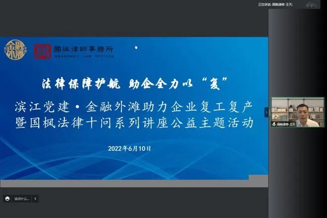 日前,一场滨江党建·金融外滩助力企业复工复产的公益主题讲座活动顺利开讲。北京国枫(上海)律师事务所律师刘沁茹围绕招聘录用阶段以及劳动合同的订立、履行、解除等4个劳动用工热点为滨江党建成员单位释疑解惑。