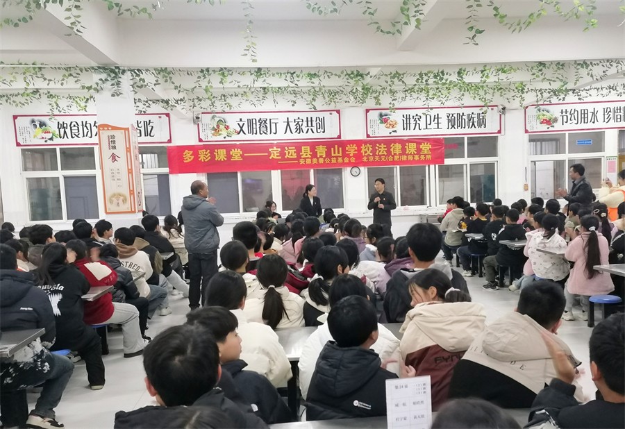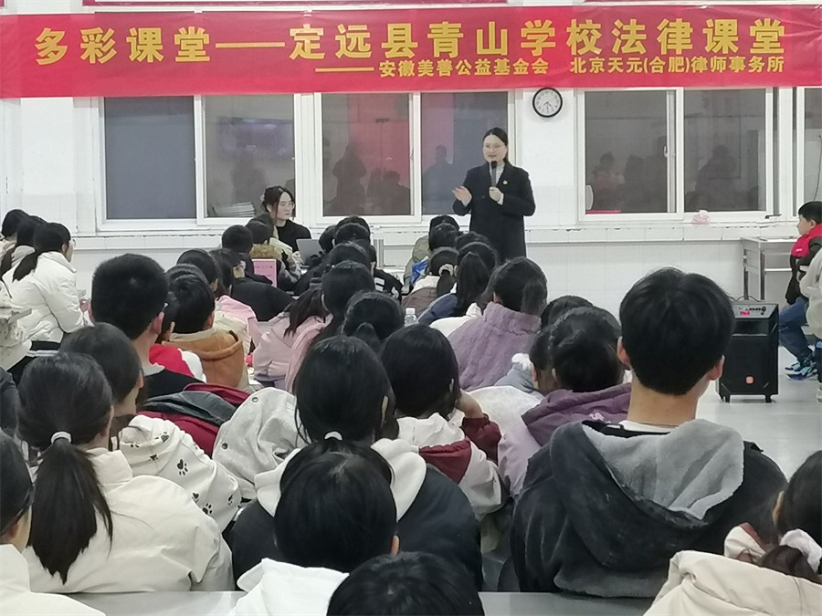 为进一步增强青少年的法治观念,弘扬宪法精神,12月4日,“国家宪法日”当天,定远县青山学校携手安徽美善公益基金会及北京天元(合肥)律师事务所,为该校六到九年级260多名同学举办了一场内容生动而富有意义的“法律课堂”进校园活动。