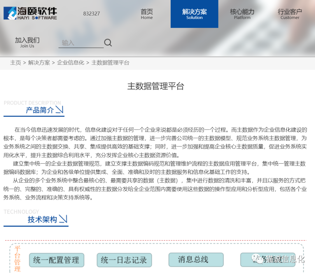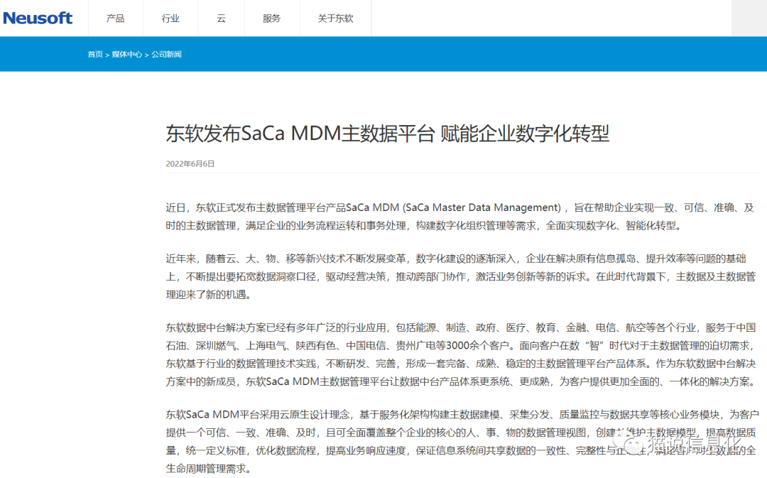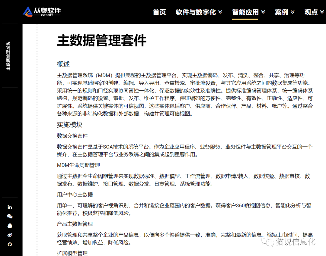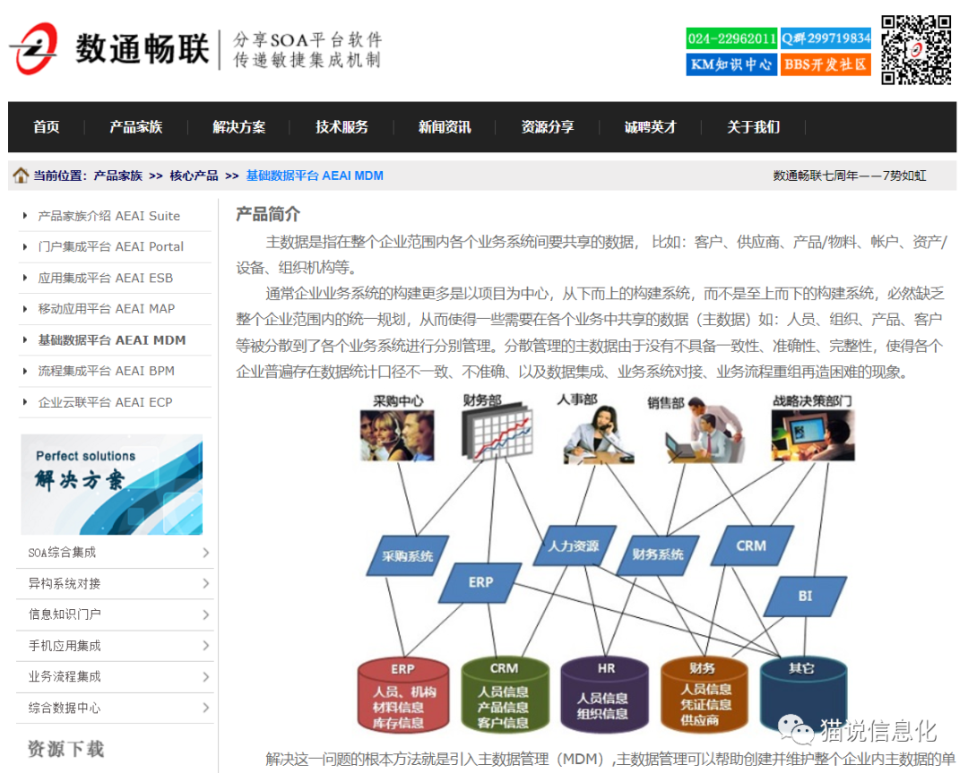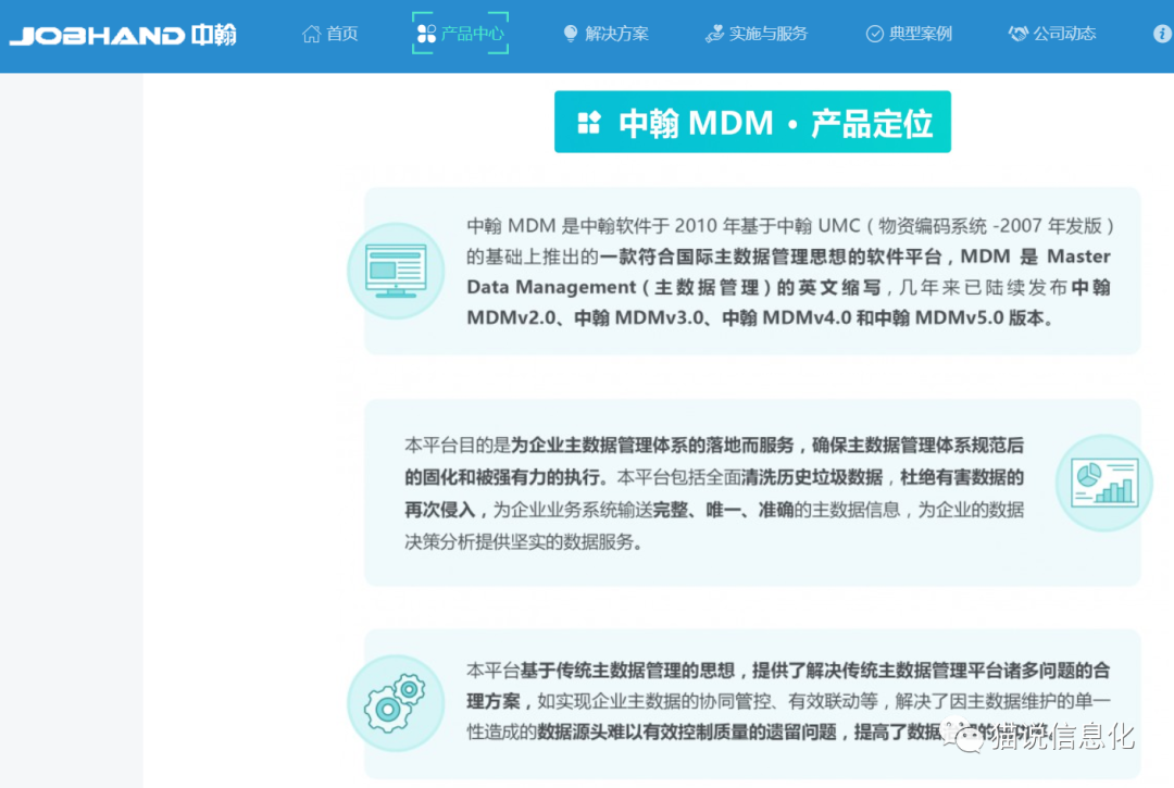 在多系统集成时主数据管理系统(MDM)是很常用的软件,例如异构系统之间,跨组织应用的系统之间。因为很常用,所以开发主数据管理软件产品的厂商也很多,首先是以包括主数据管理系统为主要产品的一些专业的数据管理类软件厂商,而且这些厂商不少都是从主数据管理起步逐渐发展为综合性数据软件厂商的,例如三维天地、美林、亿信华辰等。还有一些专业数据类软件厂商开展过主数据业务,但现在从其官方资料中不能直接找到主数据的内容,可能是涵盖在其大数据平台、数据治理平台等产品中了,这部分厂商本文暂不介绍。其次是包括以ERP软件产品为核心的企业管理软件厂商,例如用友、金蝶、浪潮、SAP等,较多的企业信息化项目是以ERP系统为核心按需集成相关应用系统的,那么为了更好的实现集成,ERP软件厂商就相应开发了主数据管理软件产品。再例如一些有规模的、综合性的企业信息化厂商,因为这些厂商承建的很多项目都有大量的系统集成内容,所以也开发了自己的主数据管理软件,比如汉得、元年、石化盈科、昆仑数智、英诺森、软通动力等。还有若干种情况,总的来说,如果厂商经常要实现系统集成应用,往往就会开发自己的主数据管理软件产品。此处需要说明的是,主数据首先是用于系统集成的,主数据管理是为了实现系统集成时数据和业务的互通互联,保障主数据的唯一性、标准性和共享性的,进而保障业务数据的一致性。所以很多年前在面向服务的体系架构下(SOA),与企业服务总线系统(ESB)一起,很好的解决了系统集成的问题。而主数据作为数据的一种,自然也会被列入数据治理的范畴内,并随着近些年开始被广泛重视的数据治理而被进一步关注到,但实际上主数据以及主数据管理系统是远远早于数据治理热潮之前就被广泛应用的,主数据管理软件的产品也已很成熟,并且也随着技术的发展,在本地部署的产品之外也出现了云版本的产品,为用户提供了更多的选择。