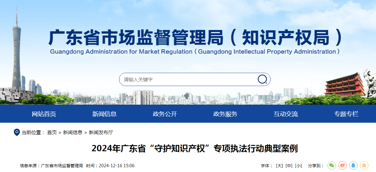 2024年以来,广东省市场监管系统严格落实市场监管总局、国家知识产权局有关工作部署,按照省委、省政府有关工作要求,不断加强知识产权执法工作,认真开展“守护知识产权”专项执法行动,依法查处了一批典型知识产权违法案件,有力地保护了权利人和消费者合法权益。为加强社会监督,充分发挥警示震慑作用,现对外公布一批知识产权执法典型案件。