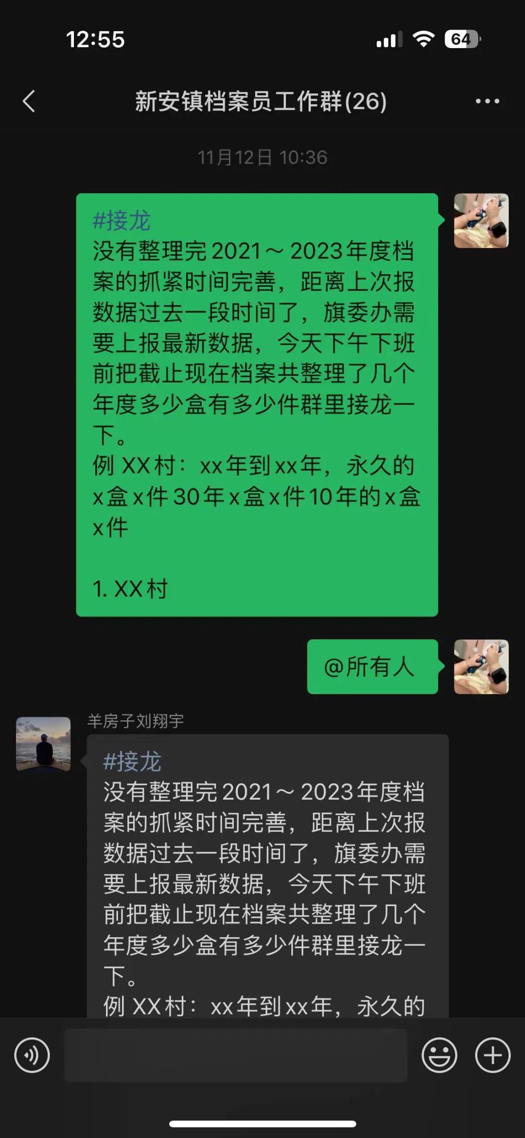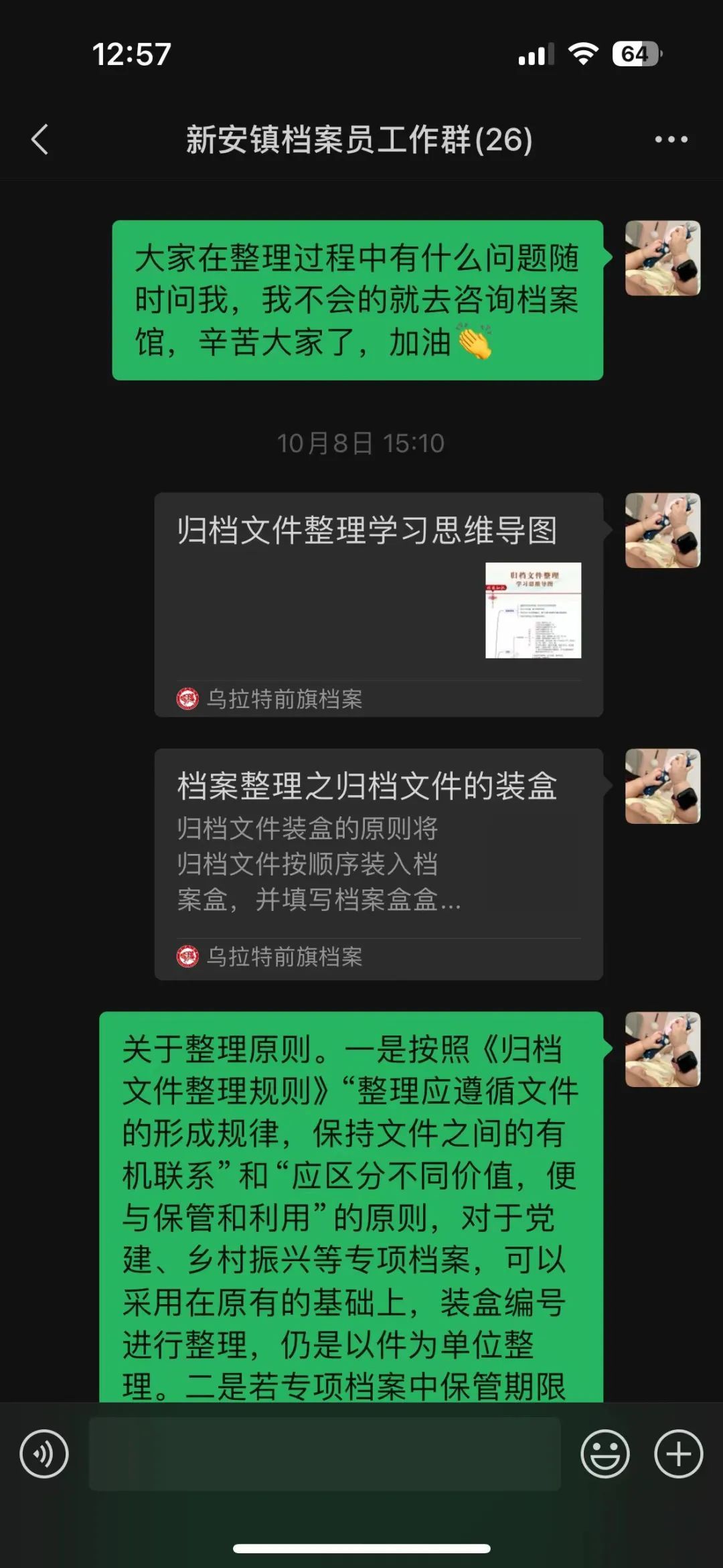 同时,为确保档案整理工作的高效推进和质量稳定,镇里建立了线上督导机制。镇档案管理员借助微信工作群定期向各村发送工作要求和阶段性任务目标,明确时间节点和工作重点。村档案管理员们则需要按照要求及时在群里汇报工作进展情况,包括已完成的档案数量、正在进行的工作内容以及遇到的问题等。此外,镇档案管理员还会通过微信工作群定期向各村档案管理员普及档案整理知识。通过这种线上线下相结合的督导与培训模式,全镇档案整理工作形成了一个有机整体,各个环节紧密衔接、协同推进。