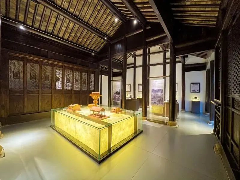 展厅二历史展示馆,对应“生存”的设计理念。对于破败的老建筑,中建八局在“清理”无法使用的部分后,保留原村史馆的木承重结构和中庭,打造与原老建筑有关联的新建筑,使“新老”建筑「共存」。展厅内讲述了章堰村历史发展脉络,通过人物、名胜介绍,将千年古村的演变娓娓道来。
