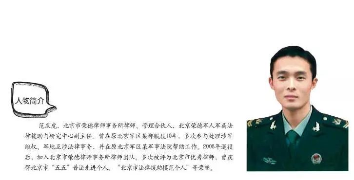 在全国40多万律师队伍中,范庆虎有一席之地。他说:“身为军地互涉法律事务律师,我有责任和义务守好这块阵地,当好涉军维权普通一兵,为国家和军队的法治建设贡献智慧和力量。”