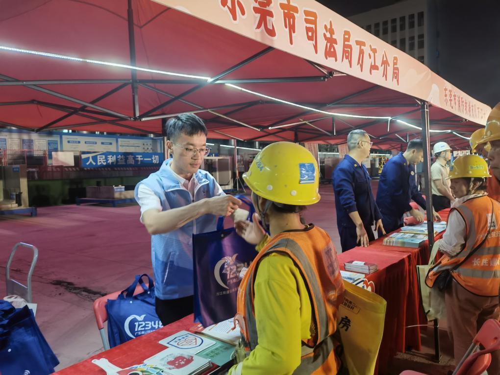 东莞市司法局万江司法分局在东莞市人民医院科教综合楼和急救中心工程现场举行2024年东莞市建筑业工伤预防现场宣传咨询活动,发放法律援助、生产安全以及工伤保险政策资料约600余份,围绕工伤认定、法律援助申请范围及流程,劳动合同的签订、工资支付、建设项目安全管理等问题进行了详细解读,吸引建筑工人200余人参加。
