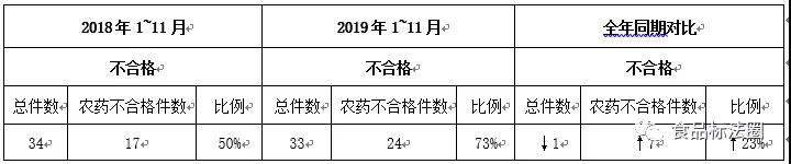 韩国实施农药肯定列表制度后,对我国农产品出口带来了有何影响那?食品伙伴网日韩法规研究团队对韩国官方发布的2018年和2019年(1~11月)输韩农林产品不合格通报信息进行了汇总,如下表1所示: