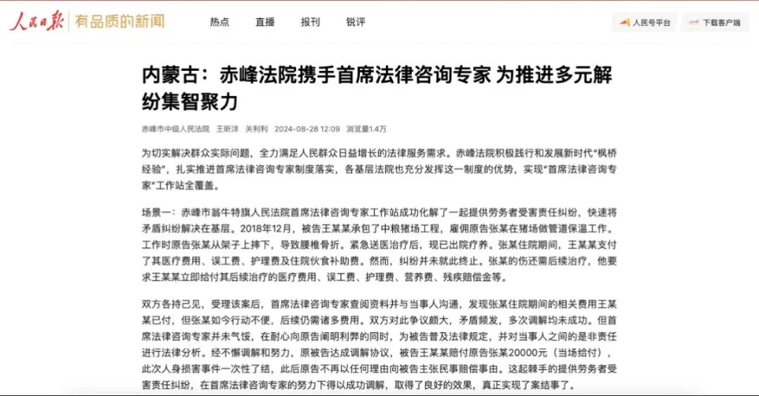 【媒体关注】人民日报客户端丨赤峰法院携手首席法律咨询专家 为推进多元解纷集智聚力