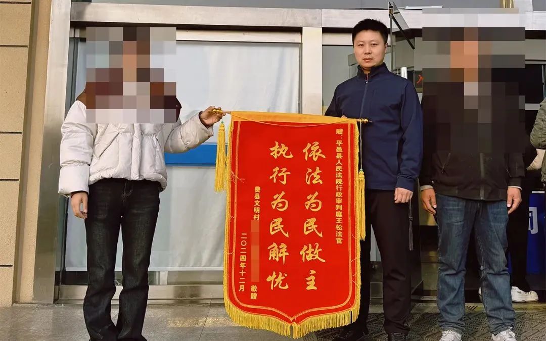 “叮铃铃……”,办公室的电话铃声响起,“你好!请问是平邑法院行政庭吗?真是太感谢你们了!困扰我们这么久的事情终于在年前解决了!”案件和解后,当事人来到法院当面向法官和我表示感谢,并送来了一幅印有“依法为民做主,执行为民解忧”的锦旗。