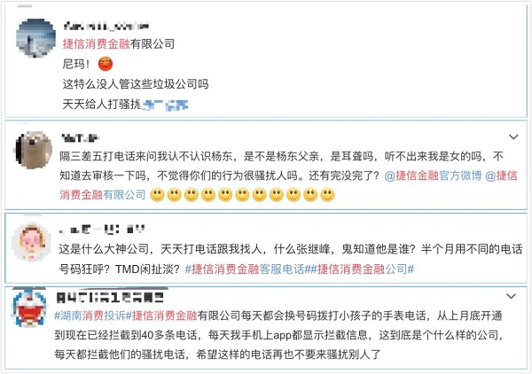 其中,风控审核方面的短板,是决定一家消金公司能够构建起核心竞争壁垒的关键。镭射财经注意到,今年6月以来,不少用户在微博等社交平台上表示,被捷信频繁拨打骚扰电话,并被错认为某人,在用户明确表示真实身份后,仍然继续收到捷信方面的来电。