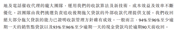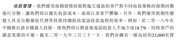 招股书显示,捷信拥有约22,000名实地及电话催收代理的庞大团队,运用收款算法及新技术,成本效益及效率不断优化。庞大的催收队伍,是要为不良贷款负责的。