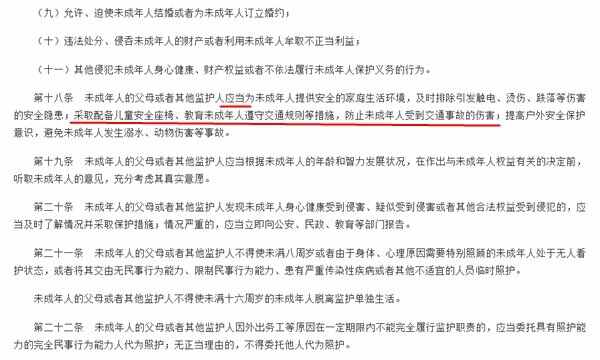 在国家新交规中,规定了4岁以下儿童必须使用儿童安全座椅,而12岁以下的儿童是不能够坐副驾驶上。另外,在2021年6月1日正式实施的新修订《未成年人保护法》中,也明确规定“采取配备儿童安全座椅、教育未成年人遵守交通规则等措施,防止未成年人受到交通事故的伤害”。