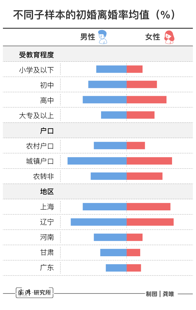 首先,受教育程度和初婚离婚率之间在某种程度上呈现出倒U型关系。一方面,高中以上学历群体的初婚离婚率要高于小学及以下学历和初中学历的群体。这表明,随着受教育程度提升,人们更倾向于对离婚这一选择持开放态度。