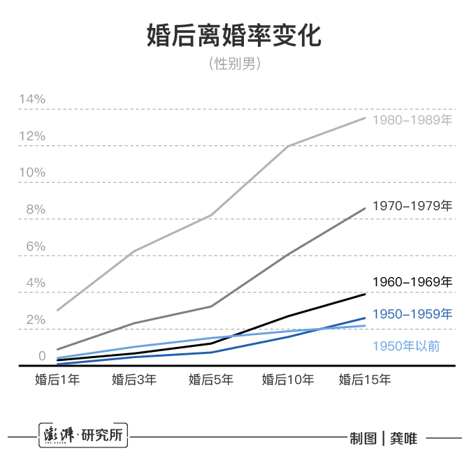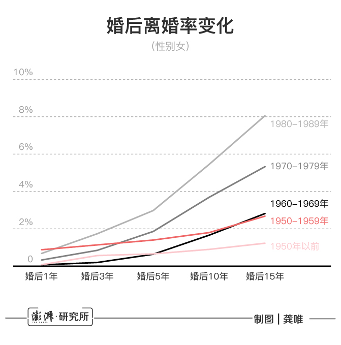 当期离婚率的上升还会对未来的离婚行为有“正反馈”效应,刺激离婚率继续上升或维持高位。具体来讲,离异行为的“普遍化”,一方面会促使社会规范和文化观念发生转变,让离婚更容易被大家所接受。另一方面,它还会提高婚姻市场上大龄潜在伴侣的供给,使得人们更少地顾虑离婚后找不到合适的再婚对象。