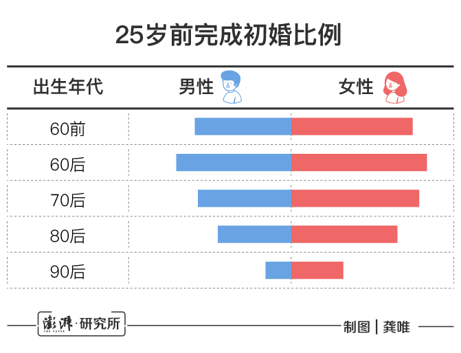 与1960年前出生的世代相比,60后、70后在初婚模式上的主要区别在于22岁前的早婚概率明显减少了。这在某种程度上跟1980年《婚姻法》修订中的提高法定婚龄以及后来的中等教育和高等教育扩张有关。但到了23岁之后,这两个世代在各年龄段上的初婚完成率大致相同。