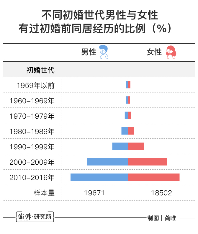 值得一提的是,相较于CFPS 2014的相应数据描述,几乎所有世代中回答有过婚前同居经历的比例都出现了上升。除了样本差别之外,还可能是因为人们对婚前同居行为在态度上变得更加接受,早期世代更敢于在受访时承认自己曾经的婚前同居行为。