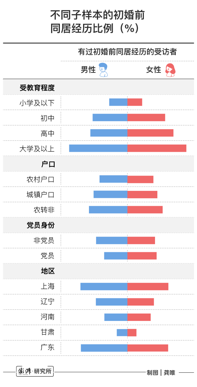 首先,受教育程度越高,越有可能发生初婚前同居行为。比如说,小学及以下学历组的男性和女性有过初婚前同居的比例分别是7.9%和6.4%,而在大专及以上学历组中相应比例则高达25.3%和25.6%。