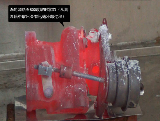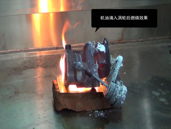 实验过程首先将涡轮增压器放入高温加热炉中,分两次加热至600与800摄氏度,模拟其实际工作温度,加热后将其取出暴露在常温下,由于温差,增压器取出后瞬间冷却至400至500度左右。此时,实验人员分别将全合成及半合成机油滴在表面温度不到500度的涡轮增压器表面。结果显示,不论是何种机油,只需几滴便已经出现了明火。(如下图)