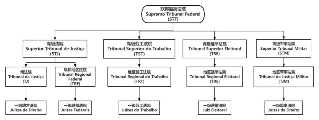 联邦最高法院(STF):作为巴西司法体系的最高司法机关,联邦最高法院仅负责确保遵守《巴西联邦宪法》,并对违反宪法的案件拥有最终决定权。[6]