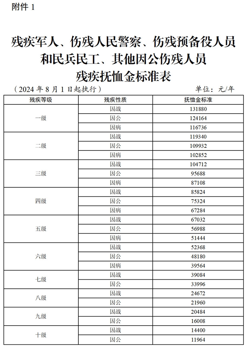 1.残疾军人、伤残人民警察、伤残预备役人员和民兵民工、其他因公伤残人员残疾抚恤金标准表