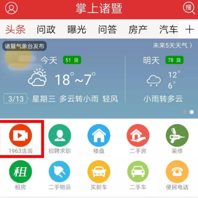 1. 下载掌上诸暨APP,点击首页“1963法润”直接收看;