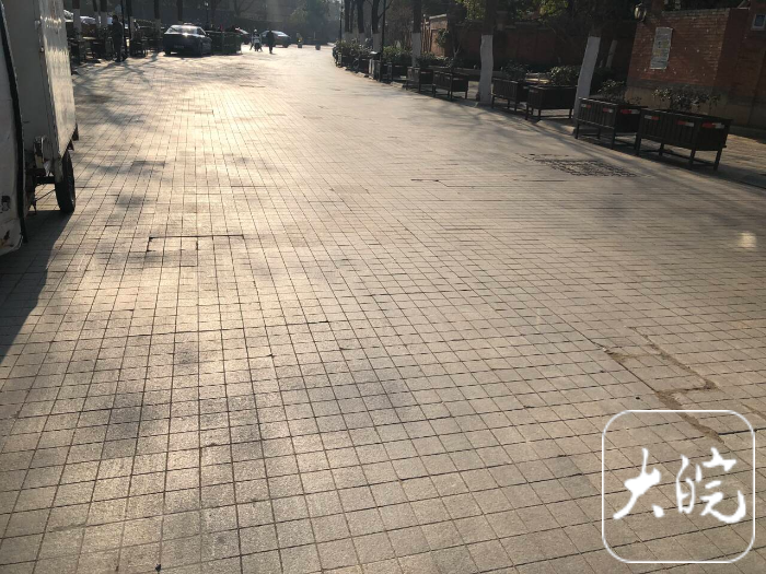 1月30日下午,大皖新闻记者来到明光路与淮浦街交口,从路口沿淮浦街向南走去,与记者上次来探访明显不同的是,一些凹凸的或破损的铺砖都已被修复。记者走到古井丰水源小区东门,此前这里有几处成片铺砖凹陷和破裂损坏的情况,已经都被修复了。