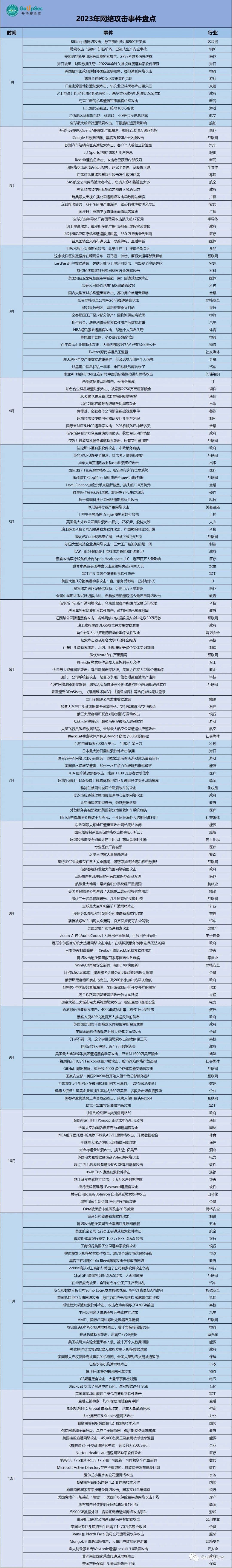根据GoUpSec对国内外网络安全攻击事件的统计分析,2023年全球网络攻击的十大主要垂直行业分别是:政府、医疗、通讯、IT、金融、能源、航空、汽车、酒店、零售业等行业。