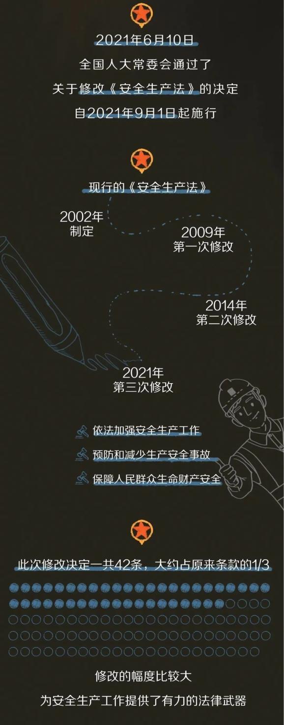 2021年6月10日,中华人民共和国第十三届全国人民代表大会常务委员会第二十九次会议通过《全国人民代表大会常务委员会关于修改〈中华人民共和国安全生产法〉的决定》,自2021年9月1日起施行。