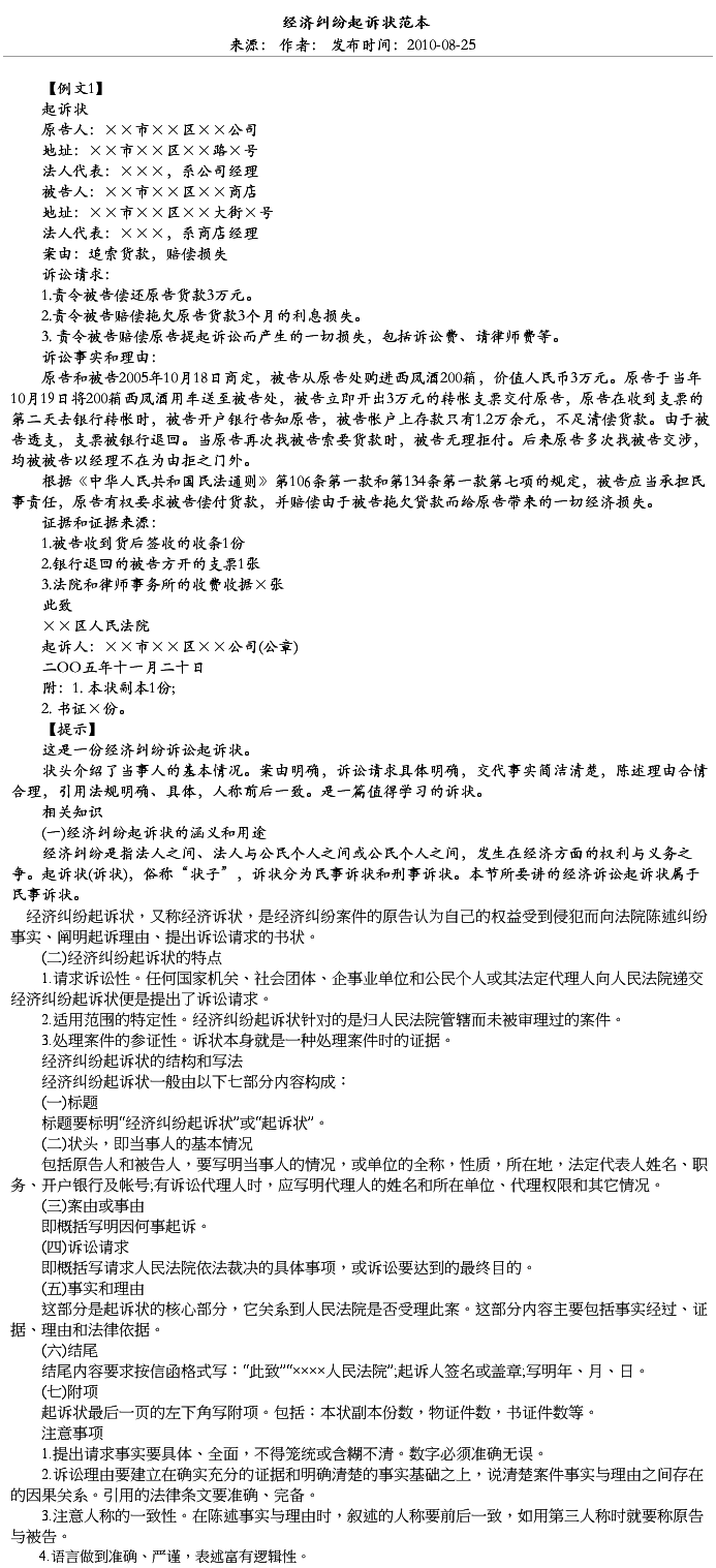 篇八 :经济纠纷起诉状范本