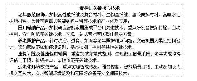 (二)发展智能化日用辅助产品。针对老年人生活辅助需求,发展生活起居、出行移动、交流通讯、休闲娱乐等老年产品。发展适老化家电、家具产品以及新型照明、洗浴装置、坐便器、厨房用品、辅助起身、安防监控和家务机器人等适老化智能家居产品。发展智能轮椅、生物力学拐杖、助行机器人等各类助行和跌倒防护产品。发展智能助视器、高端助听器、辅助阅读和发声、适老化的计算机软硬件和手机应用程序等交流通讯产品。发展老年益智类玩具、弹拨乐器、心理慰藉和情感陪护机器人等老年休闲娱乐产品。