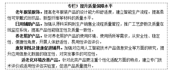 (八)提升质量保障水平。围绕老年用品产业五大领域细分市场发展趋势,从提高老年用品功能性、安全性等方面入手,结合产品生产、制造的模块化与集成化特征,推动智能制造、柔性制造、网络制造等新型制造模式创新发展。严格落实企业质量主体责任,推广和运用精益制造、全面质量管理、卓越绩效等先进质量管理技术和方法,开展质量比对、质量攻关、质量改进等活动。建设标准化、专业化的老年用品第三方质量测试平台,开展老年用品质量测评、验证和认证工作,制定产品信息和隐私安全的检测评价技术方法。