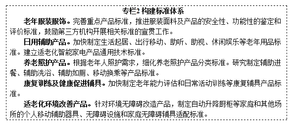 (七)加快构建标准体系。全面梳理和完善老年用品产业相关领域标准体系,面向功能性纺织品、家庭服务机器人、康复训练及健康促进辅具、适老智能家居和家电产品等领域,制修订一批关键亟需的产品和技术标准,加大对国际标准的采标力度。鼓励发展具有引领促进作用的团体标准,完善团体标准转化机制,形成政府主导制定与市场自主制定协同发展、协调配套的新型标准体系。