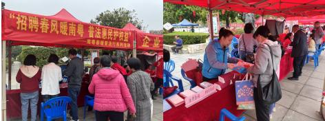 新会区司法局以春季招聘为工作契机,以“送法进招聘会”形式开展“招聘春风暖南粤 普法惠民护权益”南粤春暖普法行活动,普法志愿者向前来应聘的群众宣传宪法、民法典、法律援助法、保障农民工工资支付条例以及防范养老、电信诈骗等法律知识,解答劳动合同签订、劳资纠纷处理等群众关心的问题,帮助群众在求职过程中规避风险,提高依法维权意识。