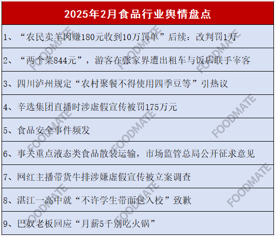 食品伙伴网讯 2025年2月食品行业舆情信息如下: