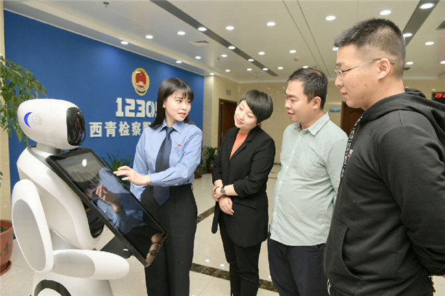 日前,天津市首个智慧检务自助服务机器人在该市西青区检察院投入使用。除担任检察服务大厅“引导员”外,该机器人还可提供预约到访、检务问答、普法咨询等服务,既满足了群众的个性化司法需求,又提升了检察服务中心的工作效率。本报记者陶强 通讯员臧萌摄