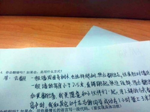人民网北京9月27日电(欧兴荣 实习生潘金洁琼)网上一张名为《笔试题你们来感受下》的照片近日很火。据传,该照片是某网络公司招聘的笔试题,题目为:你会翻墙吗?如果会,是用什么方式?该题旨在考查应聘者通过何种方式翻越网络浏览国外网站,但一位应聘者把翻墙理解成爬墙,并声情并茂的阐述了“如果有树会依托树爬出去”甚至还会“跟小伙伴们用人梯的方式翻出去”,网友看完简直笑翻了,更有网友大呼:这么有创意的答案,一定要录取他。那些年,各种民间高手曾在试卷上为我们奉献了无数笑料,想看看都有哪些吗?现在就让小编为你盘点奇葩的考试答案!